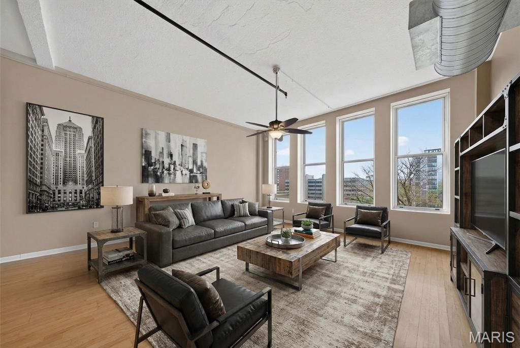 Modern condo living right in the heart of downtown St. Louis with walkability. Unit sits on the 4th floor of the Terra Cotta Lofts building over looking the Campbell house. Tall ceilings, a wide open layout, and large widows letting in tons of natural light give the unit a warm and inviting feel while maintaining the sleek modern loft athestic. This condo is one of the largest in the building, 1732 sq feet, giving you the space and comfort of a home with all the convenience you desire. Kitchen boasts real wood cabinets, SS appliances, large center island with breakfast bar, granite counter tops, and sleek tile backsplash. Adjacent dining room provides space for a large table for entertaining. Primary suite has a 8 x5 foot walk-in closet, new carpet, and luxury bath with dual sinks plus separate jetted tub & shower. 2nd bedroom has large dual closets plus adjacent full bathroom providing space for an office or guest room. Entry hall provides extra storage with dual closets. Unit comes with a deeded parking spot in the attached secure garage. Additional features include: private storage locker in basement, community storage, bike storage area, trash chute, recycling containers, and a conference room you can reserve for events. One the best features is the unbelievable rooftop! You get 2 patio seating areas, a gazebo, a grill and a front row view of the Arch and the St. Louis skyline. It's the perfect spot for morning coffee or watching the city light up at night. Building has fob and code access for security. Building sits close to restaurants, parks, & public transit. Walkability to CITYPARK (home of St. Louis City SC), Busch Stadium, Ballpark Village, Citygarden, Washington Avenue dining and nightlife, and the iconic Gateway Arch. Building is approved for conventional, FHA and VA mortgages!! This unit has an assumable VA mortgage at a 2.5% interest rate.